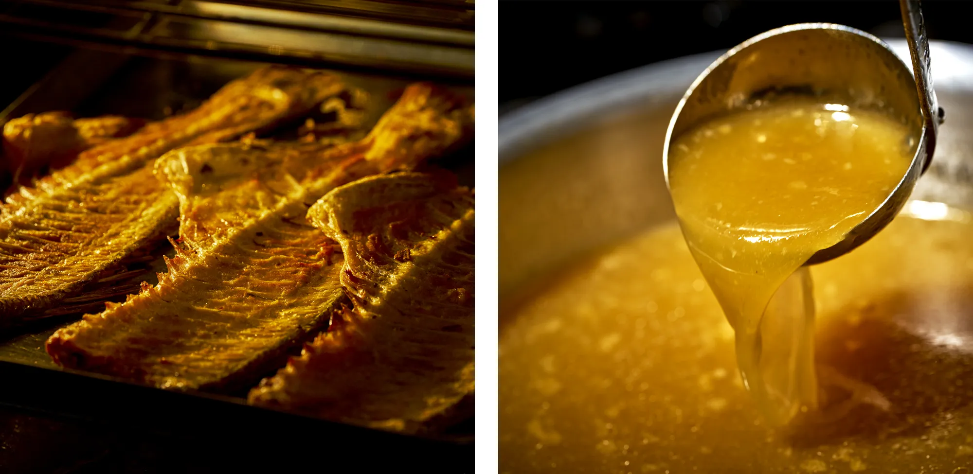 250℃のオーブンでこんがりと焼き上げた鯛アラから取っただしを使い、鯛の旨みと香ばしさを凝縮したソースに仕上げました。