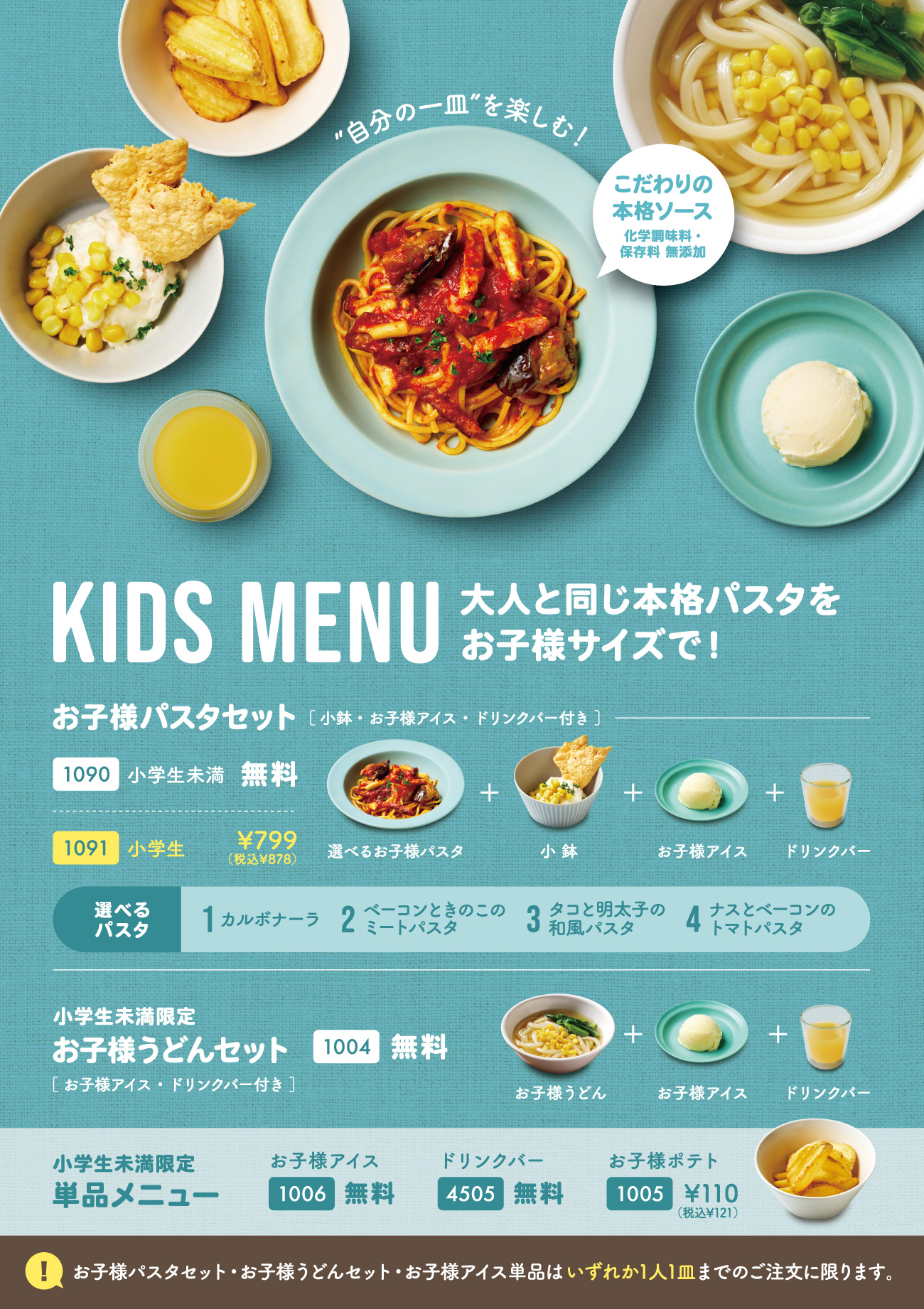 注意事項:お子様パスタセット・お子様うどんセット・お子様アイス単品はいずれか1人1皿までのご注文に限ります。