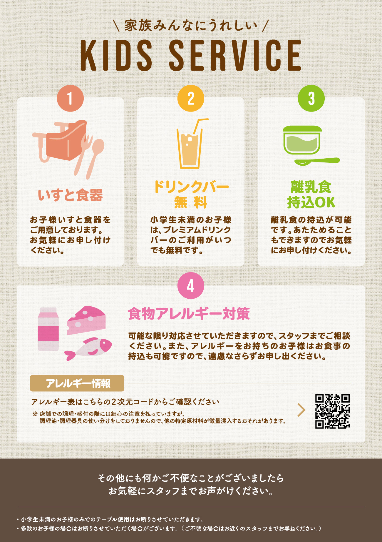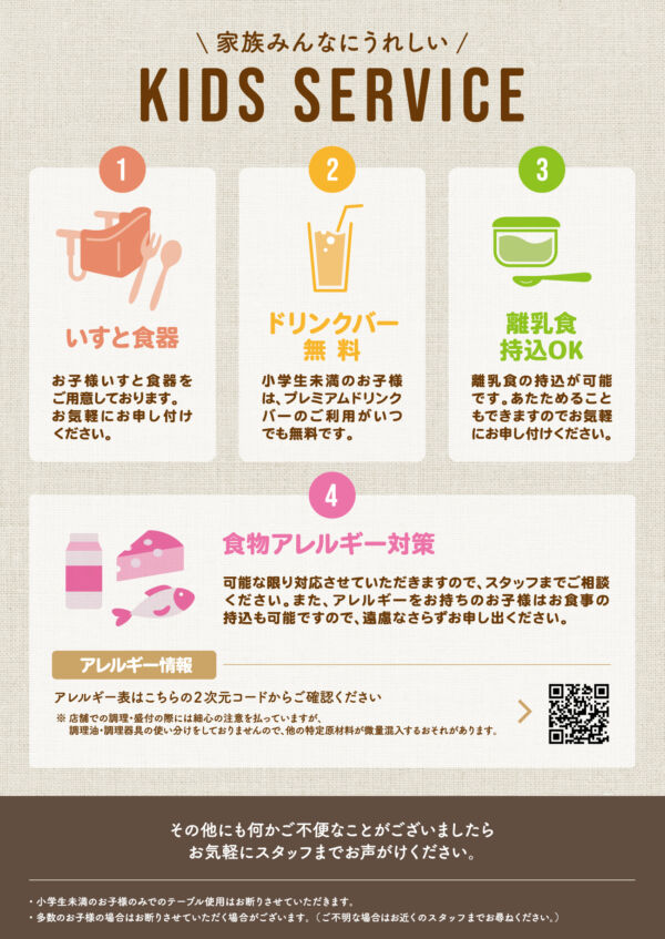 - 小学生未満のお子様:¥0(キッズメニューに含む)