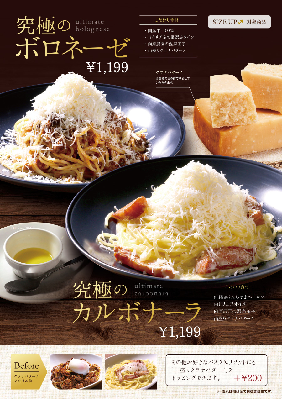 各素材に徹底的にこだわった究極の一品! 仕上げに目の前で山盛りのグラナパダーノをトッピングいたします。