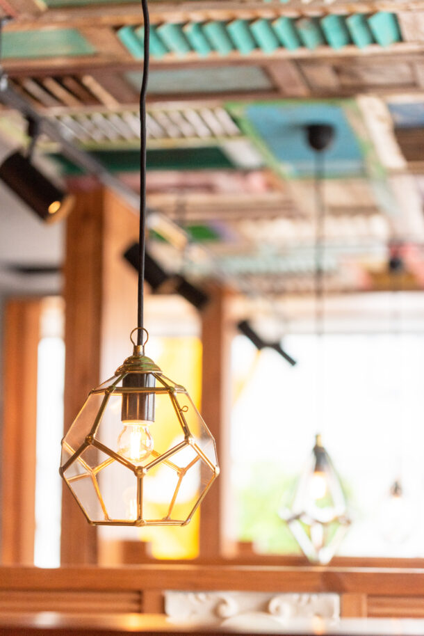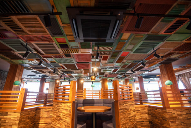 お店の至る所に窓枠をモチーフにした木材が貼り付けられております。決して主張しすぎることなく、空間の調和を保った色合い。和歌山向店に来ればすぐにバリのビーチクラブを体感できるでしょう。