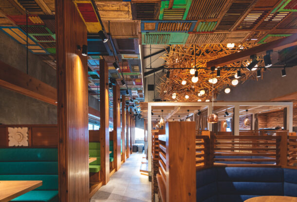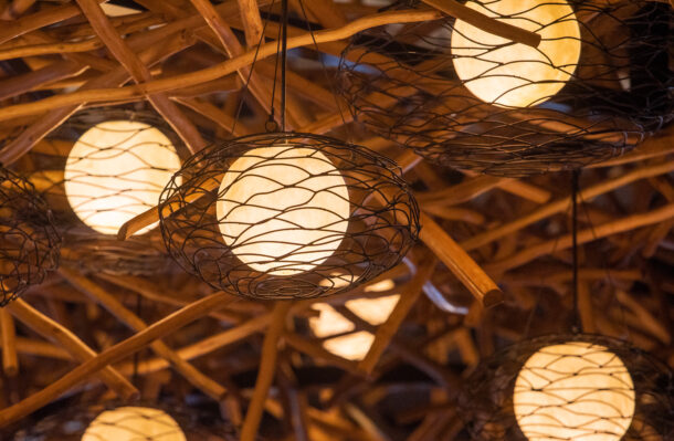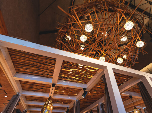 どのテーブルからでも見渡すことができる巨大な照明。木材を丁寧に組み込んで巨大な鳥の巣の形状に仕上げました。