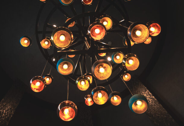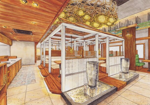 入り口を進むとまず目に入るのがペンダントライト。PISOLAが一味違う空間だと言うことを認識させてくれます。吹き抜けからまばらに吊るされた照明はとても上品な色味で統一されています。