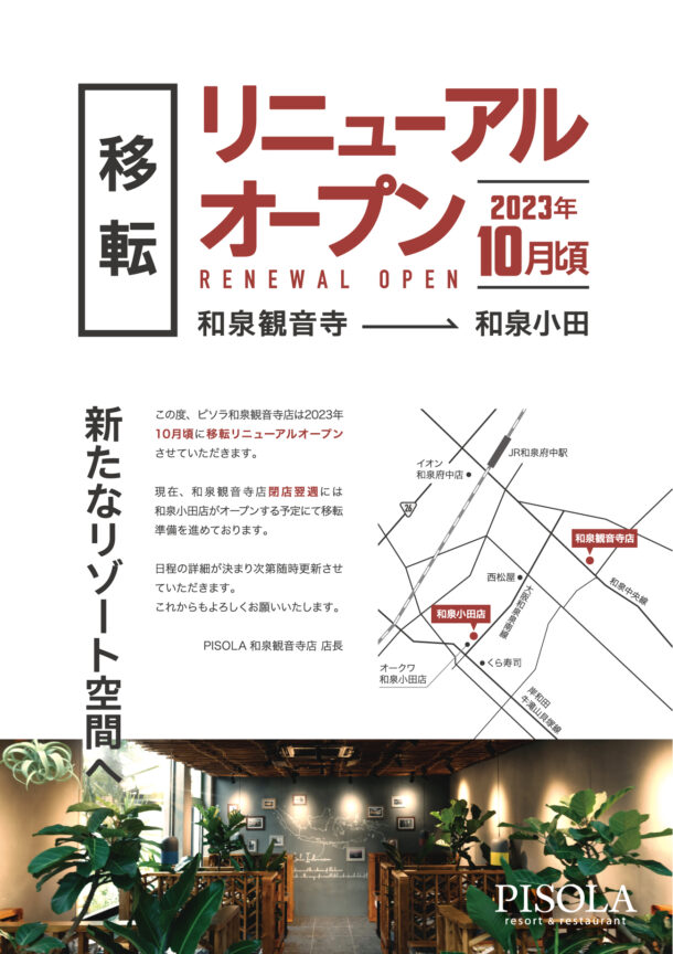 PISOLA和泉観音寺店の移転リニューアルオープンについて