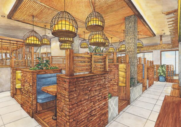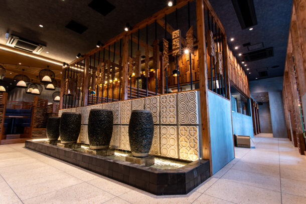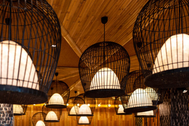 河内長野店にはリゾート気分を演出するキーアイテムとして天井高を活かした鳥籠のラタンが散りばめられております。