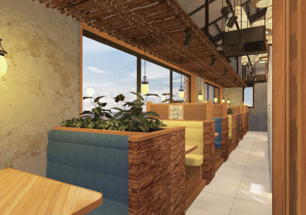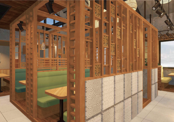 規則的に積まれた鮮やかな水色の煉瓦と職人手作りのレリーフで囲まれた建物、そして耳障りの良い爽やかなBGMが流れており、異質ではありますが入店前からリゾート気分を最大限に演出しております。